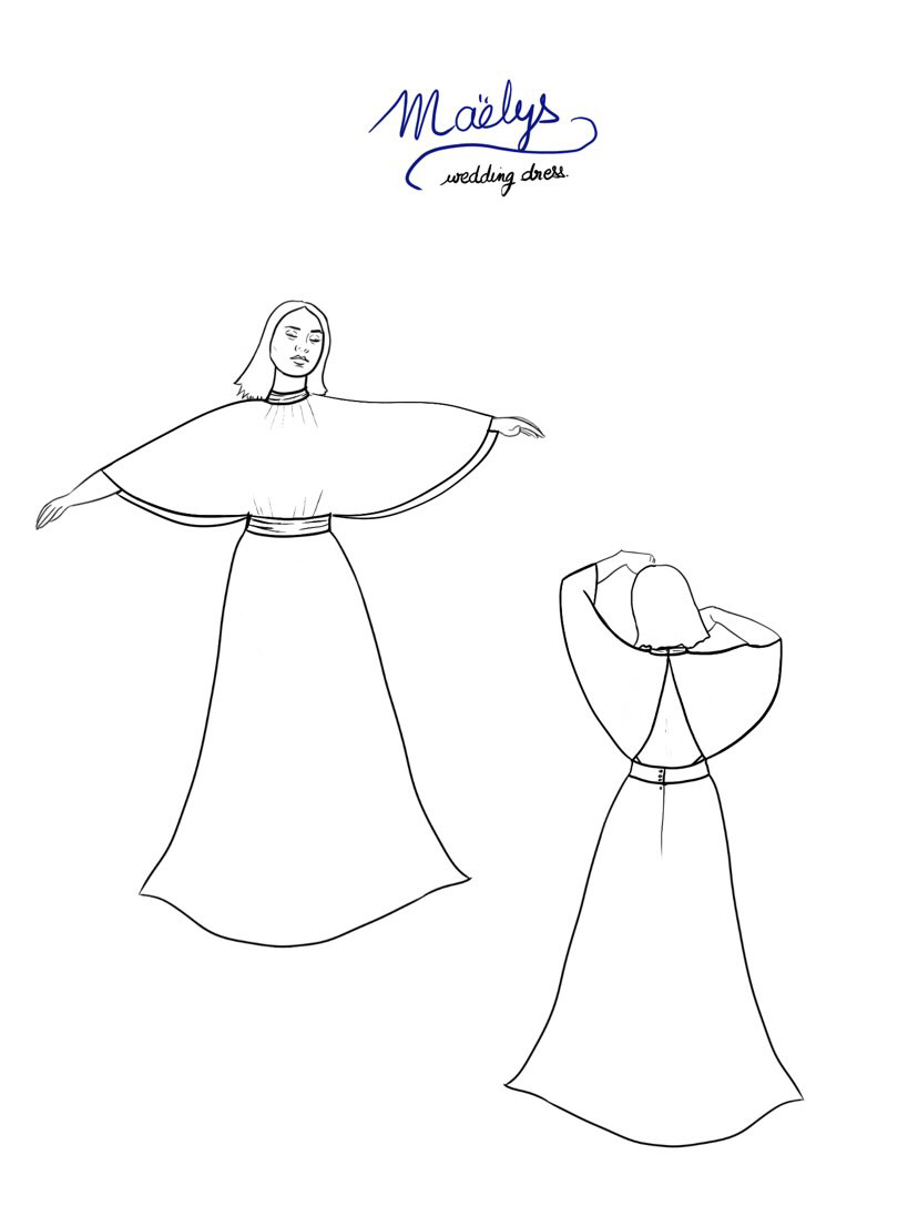 Le souhait de Maëlys: une robe hyper épurée, un profond décolleté, un dos complètement ouvert et des bretelles les plus fines possibles, agrémenté d’une petite capeline qui s’accroche sur la robe.